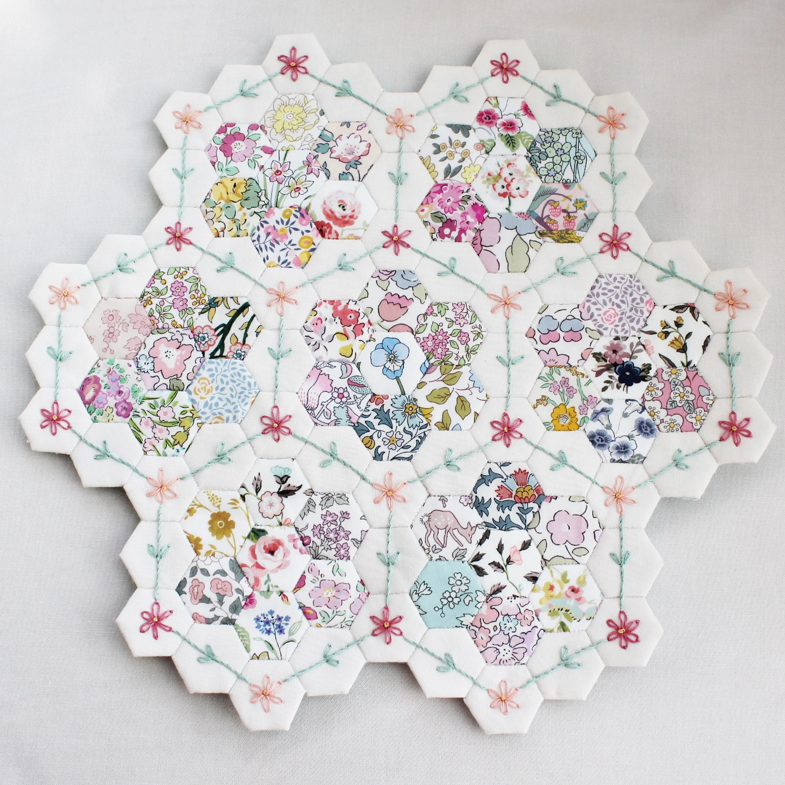 Mabel’s Garden is a beautiful hexagonal patchwork design, inspired by the traditional Grandmother’s flower garden quilt design, and my own Grandmother, Mabel. This has been my most popular design and I have welcomed many people to my studio to stitch it. Now you can join me from the comfort of your own home.